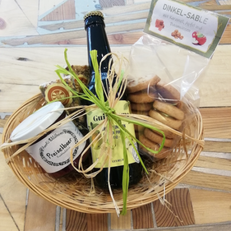 Ein Geschenkkorb aus einer bunten Mischung an Walliser Spezialitäten zum Essen, Trinken und zur Körperpflege.