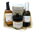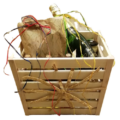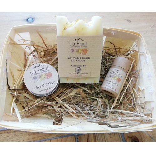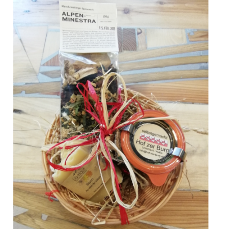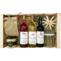 Ein Geschenkkorb aus einer bunten Mischung an Walliser Spezialitäten zum Essen, Trinken und zur Körperpflege.
