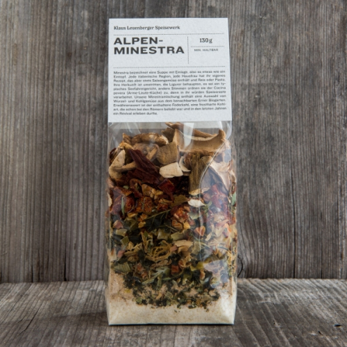 Zutaten: Karotten*, Kartoffeln, Tomaten, Lauch*, Wirz*, Federkohl*, Binntaler Waldpilze, Sellerie*, Liebstöckel, Bergkräuter*, (*alle aus dem Binntaler Biogarten), Salz, Maltodextrin, Hefeextrakt, Gewürze