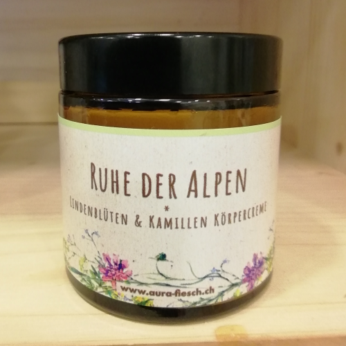 Die Körpercreme „Ruhe der Alpen“ lässt sie eintauchen in die beruhigende Wirkung von Kamille und Lindenblüten.