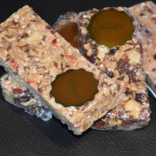 Hausgemachte Getreideriegel der Bäckerei Arnold aus Simplondorf mit Haferflocken, Cranberries, Leinsamen und Sesamsamen. Energiespender für unterwegs – sei es im Sommer beim Wandern oder auch im Winter, wenns mit den Touren-Skis oder den Schneeschuhen bergauf geht.