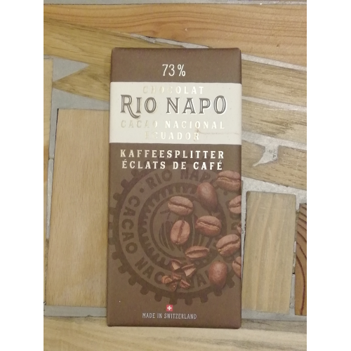 Die dunkle Rio Napo Grand Cru Schokolade mit 73% Cacao birgt die Fruchtigkeit sonnengereifter Pflaumen, ein Hauch von Kaffee und Vanille trifft auf eine feine Pfeffer-Note. Mit gerösteten Kaffeesplitter